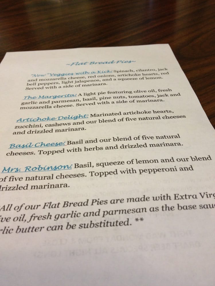 Vegetarian. Spinach, cilantro, jack and mozzarella cheese, red onions, artichoke, red bell peppers, light on the jalapeƱos with a squeeze of lemon and side of marinara.